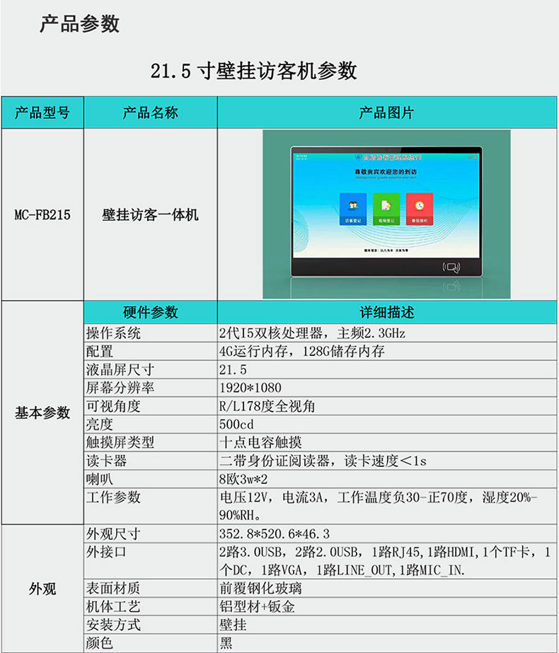 (*由于產(chǎn)品升級(jí)或其他原因,壁掛式訪客機(jī)產(chǎn)品實(shí)際參數(shù)有可能變更,以實(shí)際產(chǎn)品為準(zhǔn)。本文中的所有陳述、信息和建議也不構(gòu)成任何明示或暗示的擔(dān)保)